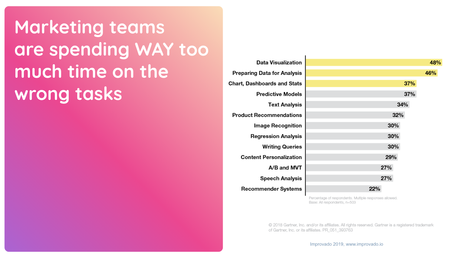 Gartner ran a study and found that marketing teams are spending WAY too much time on the wrong tasks, like data visualization, preparing data for analysis, and building charts dashboards and stats.
