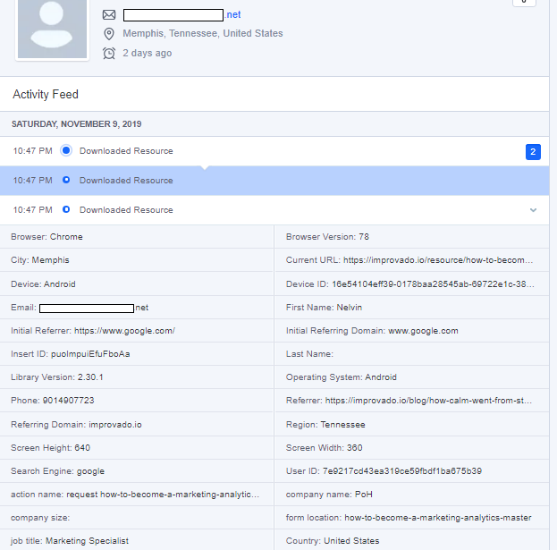 For example, in the screenshot below, you can see how Mixpanel consolidates data on a user who downloaded a resource from the website, their email, and what other actions they took on the website.
