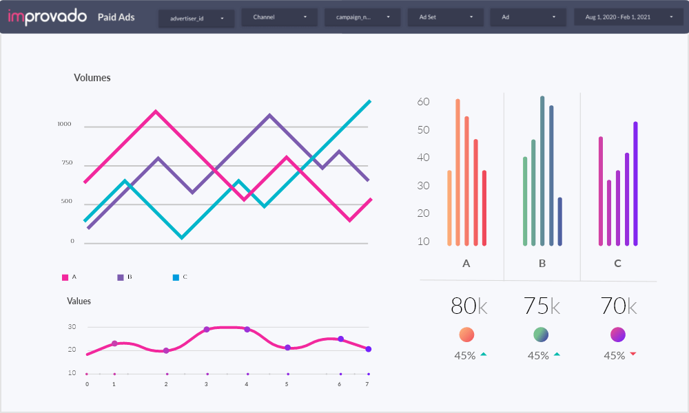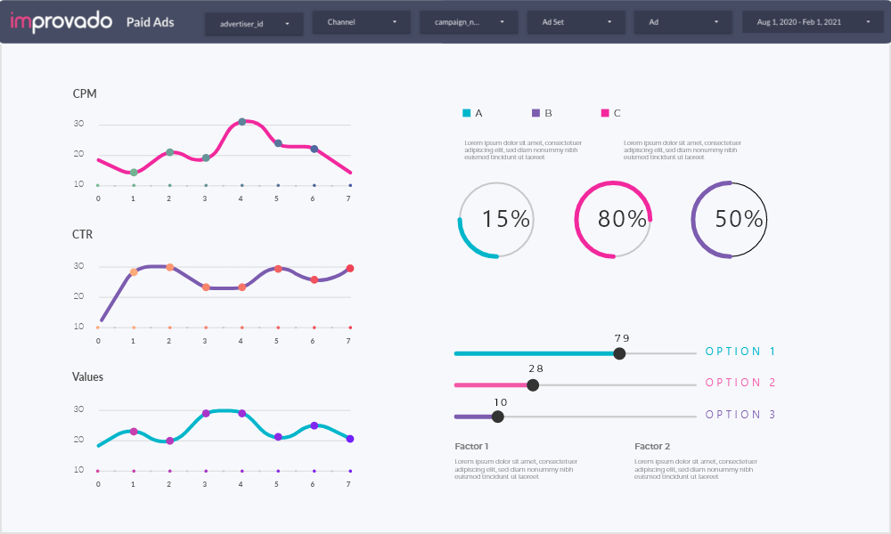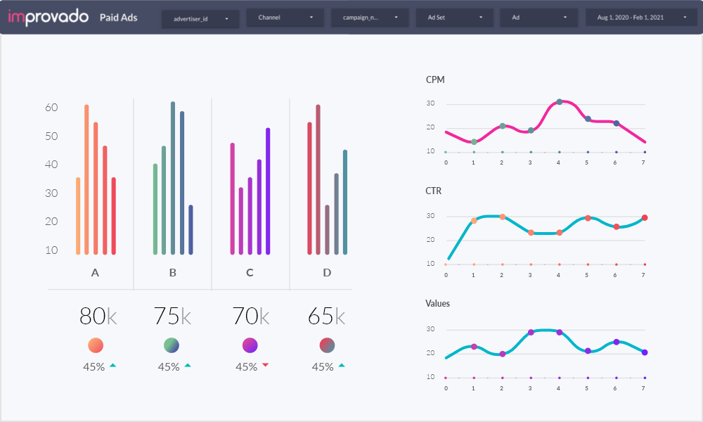 Optimize and report on display ad campaigns with confidence. Improvado lets you create custom display ads dashboards with all the metrics you want to track. Generate fully customizable dashboards that foster data-driven performance optimizations with ease and without the help of developers. Build custom real-time reports from scratch or start with pre-made templates. You can also import additional data from over 200 compatible sources, including support for social media, Gmail, CSV, and Google Spreadsheet. Improvado is what marketers use to streamline reporting and eliminate the usual headaches that come with generating reports.