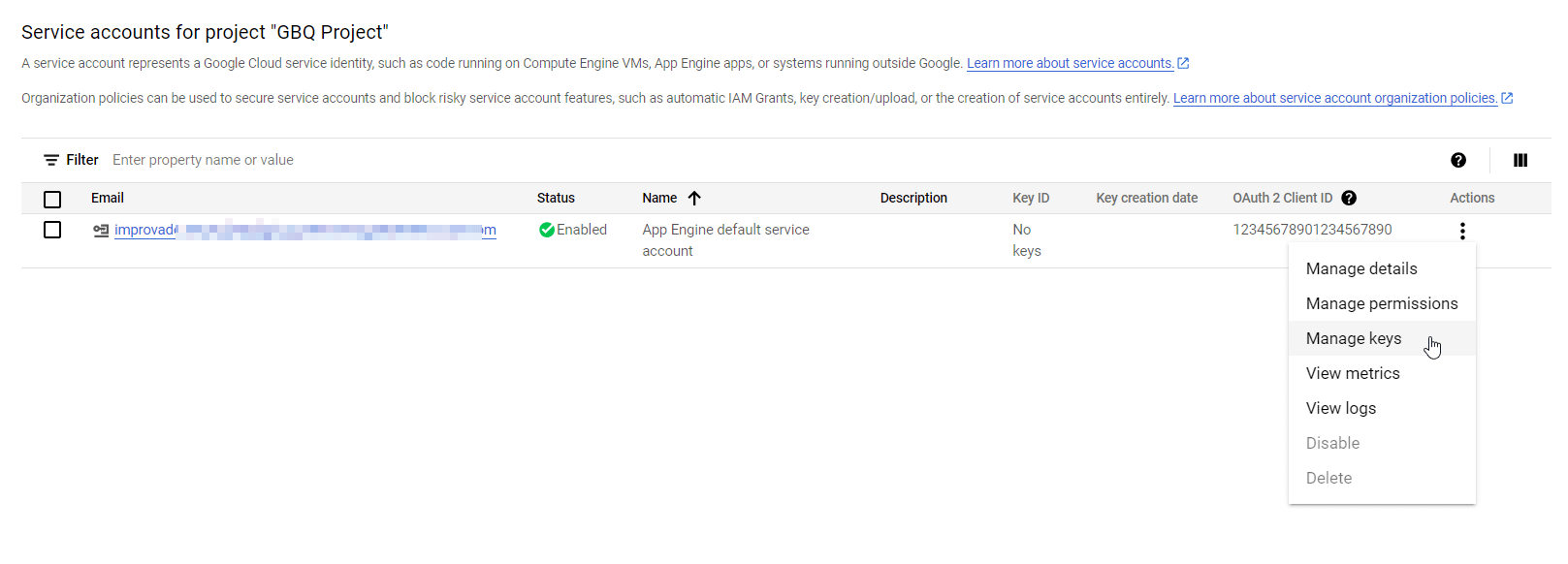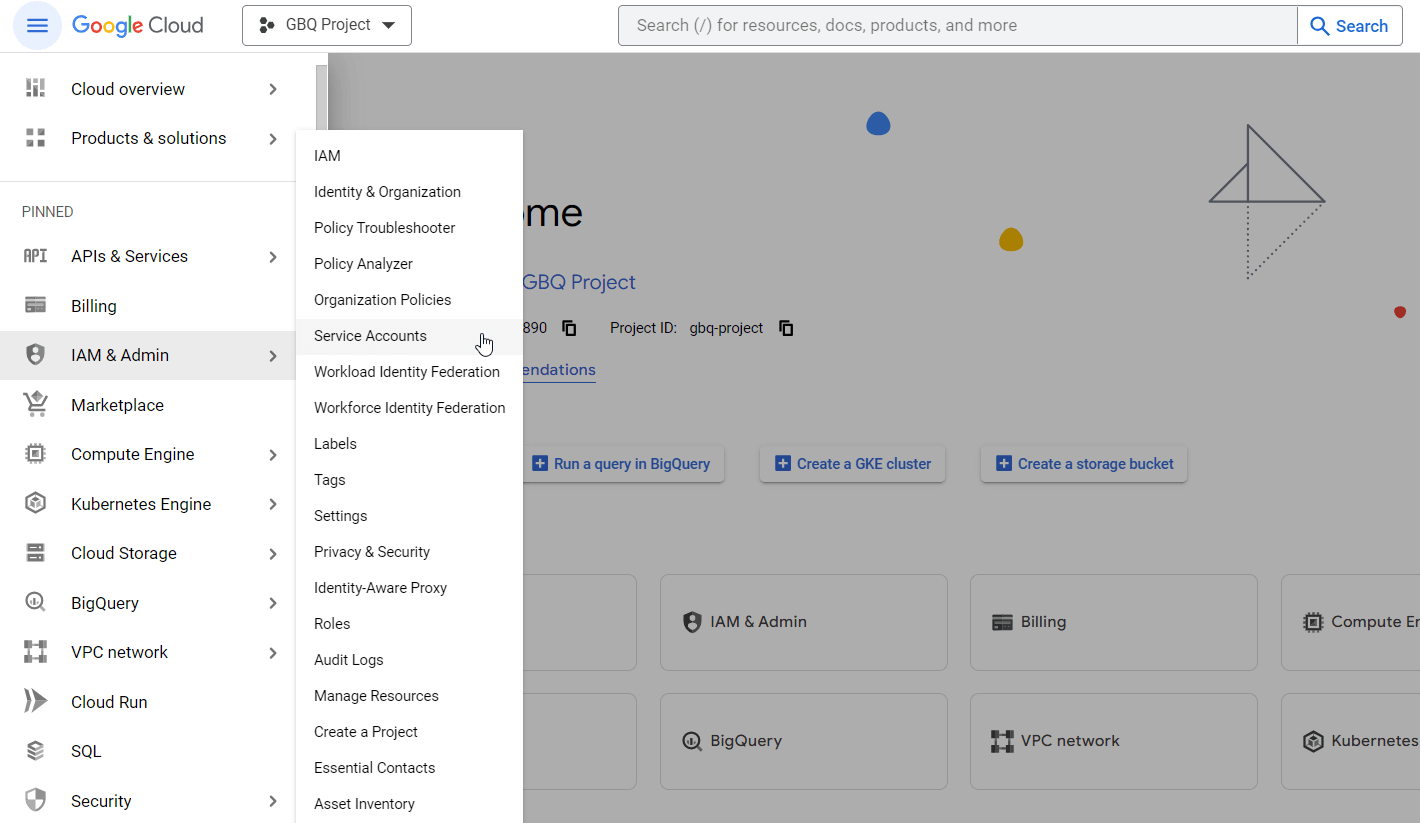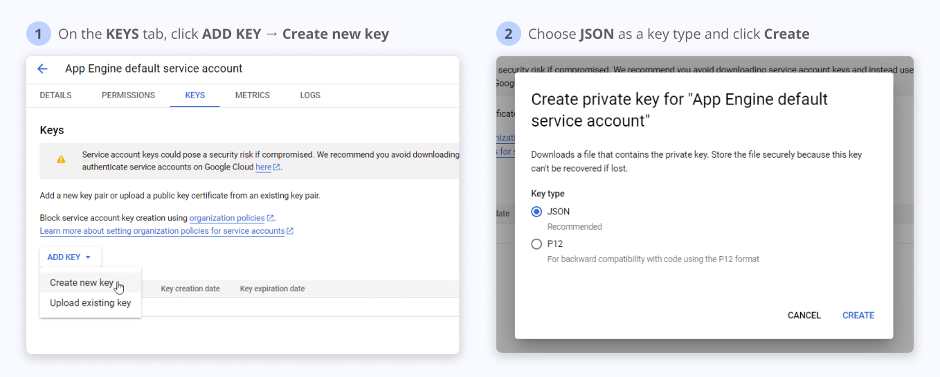In order to use Service Account Key authentication, first, you need to generate a JSON file via Google Cloud Console using official documentation or an interactive step-by-step guide provided by Google. Alternatively, you can follow the instructions below.
