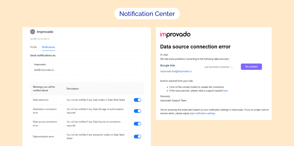 Stay up to date on your Improvado Data Pipeline 🔔 Set up the subscription via Improvado Notification Center to monitor your connected data sources, destinations, extraction, and load orders! You can also redirect our notifications to your Slack channel.