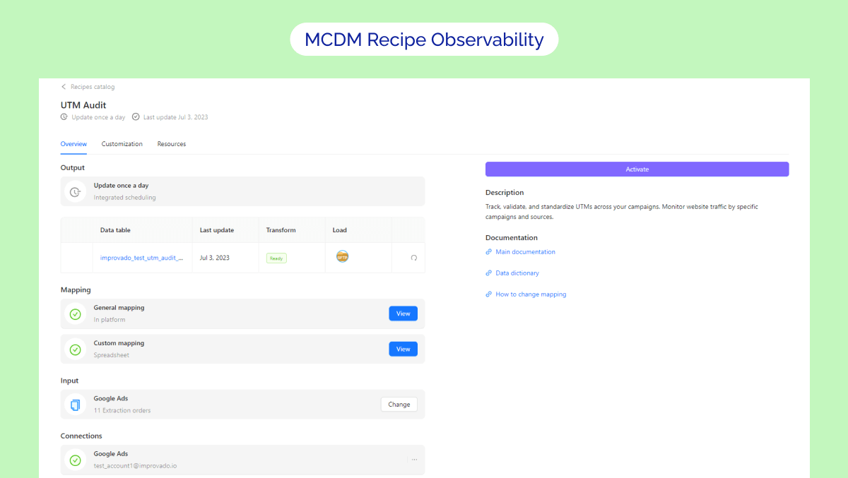 Connections. Connect your third-party platform accounts to Improvado. If you don't see the one you need among them, just request it!Input. Set up data extraction. Your extraction orders grouped by data source are an input for the Recipe.Mapping. Customize the mapping. if you find it difficult, you can always ask for help via our Service Desk.Output. Push your transformed data to the destination to visualize it on the dashboard.