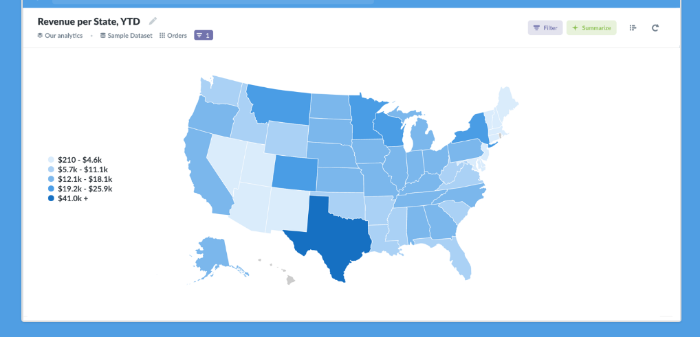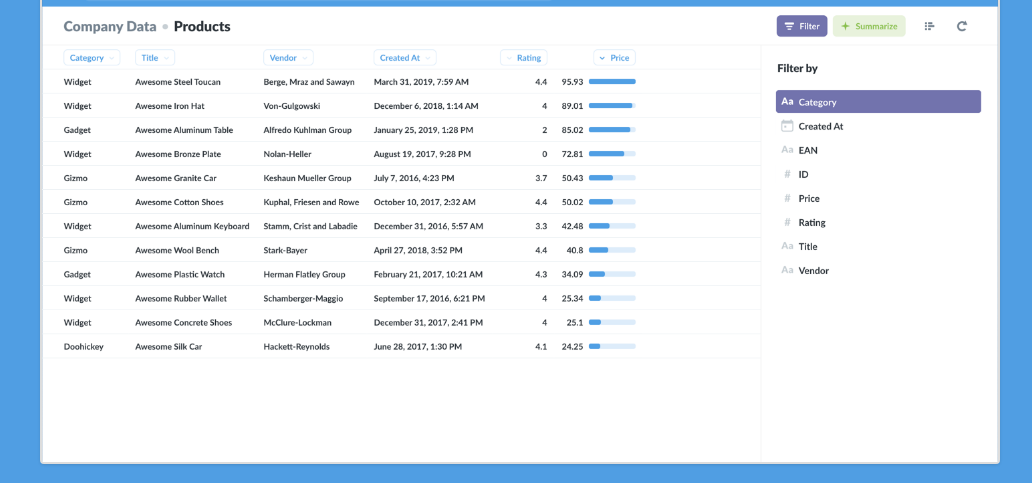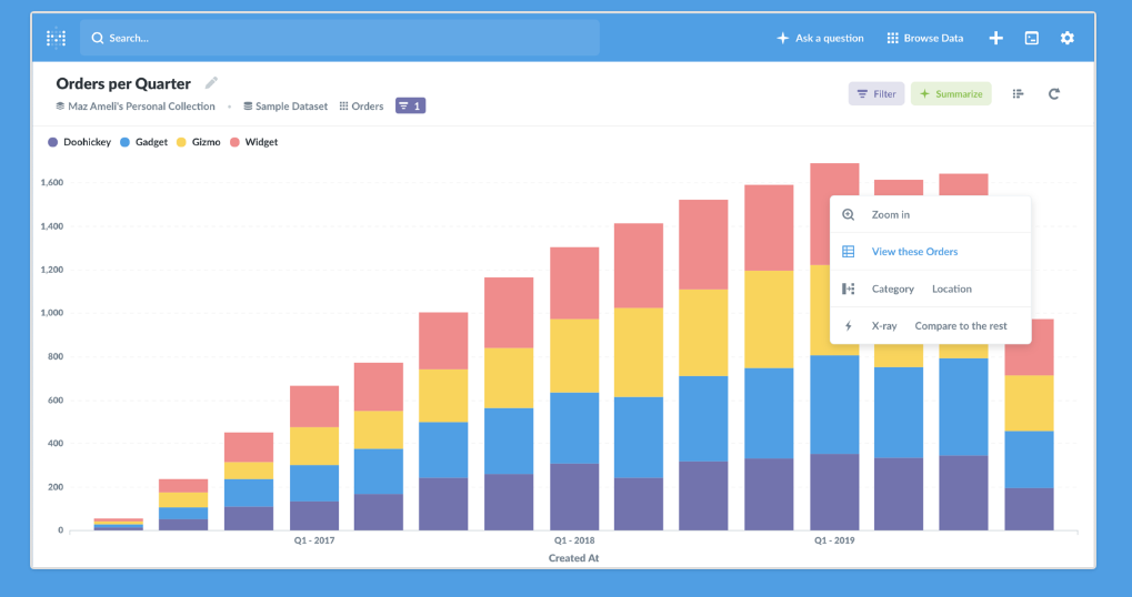 Metabase demonstrates to you a list of connected databases and offers automatic explorations of data. After asking questions about the data, you can group the received results (charts) into an unlimited number of dashboards. The Notebook editor will help you to create detailed questions.