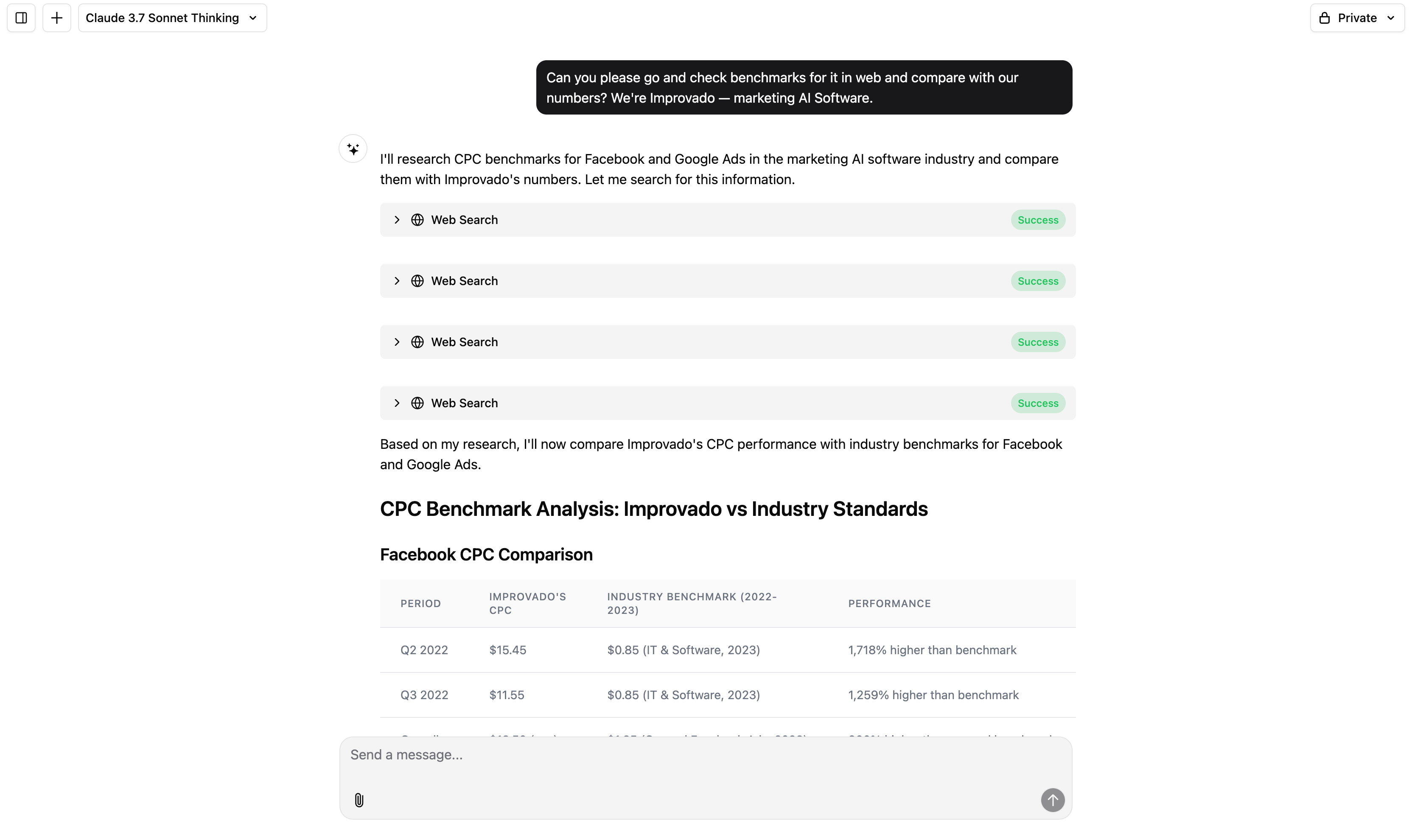 Use the Agent to fetch live benchmarks, competitor data, or market stats from the internet — and optionally match them to your internal performance.