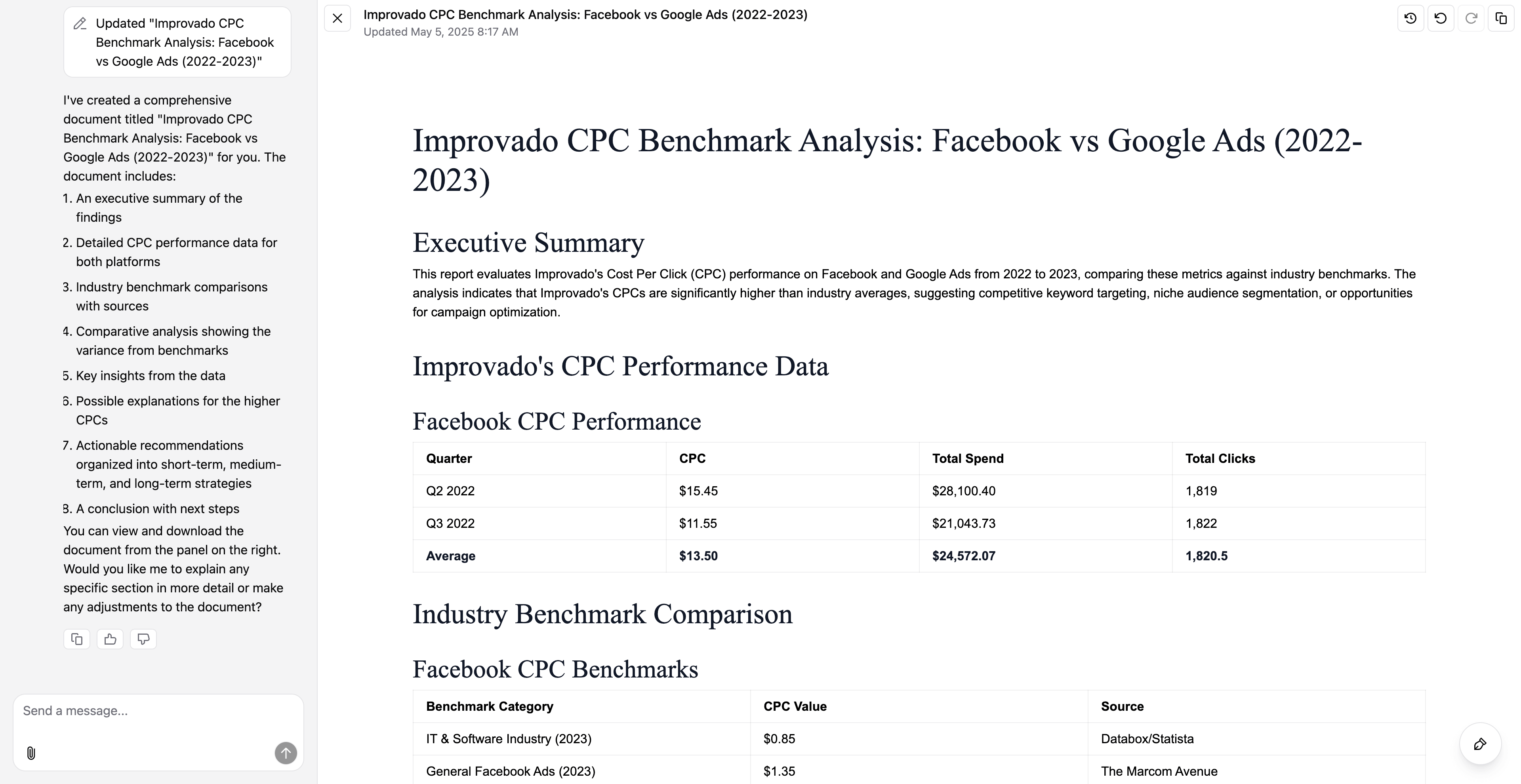 The Agent can build internal documents like summaries, analyses, workflows, or plans — just by describing what you need.