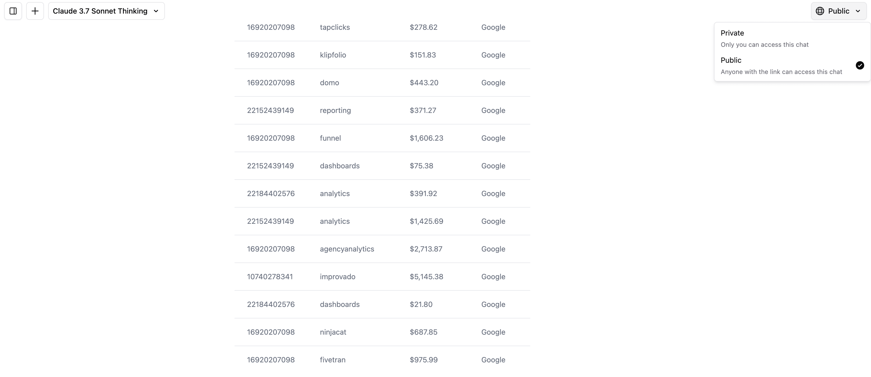 Every chat starts as private by default. You can toggle visibility to public, which will move the chat into the Shared Chats section.