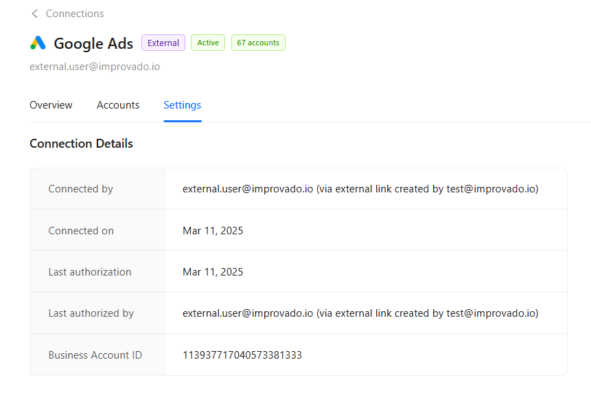 Information about who created the connection and the external link will be reflected in the connection details.