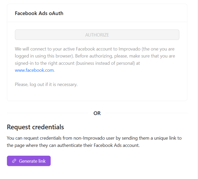 Improvado’s Request Credentials feature allows you to request an external users credentials to create a new connection directly in Improvado. Clients can authenticate their accounts without sharing sensitive login details manually, reducing back-and-forth communication and accelerating the authorization process.
