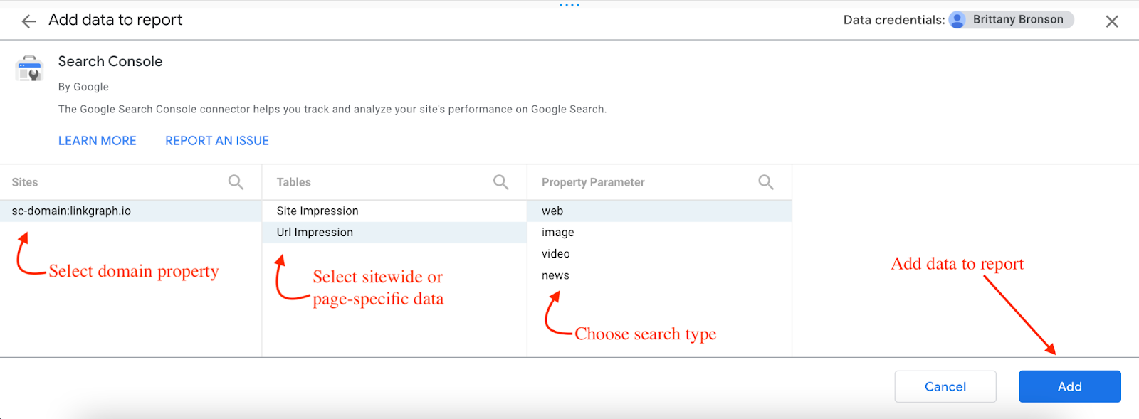 You will then be prompted to select specific parameters for the report including domain property, site impressions or url impressions, and the search type you want to see data for, whether web, image, video, or news.