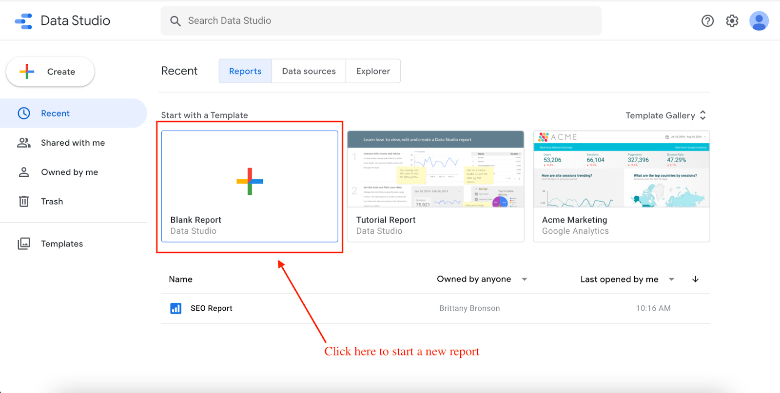 After you have made your Google Data Studio account, click “Blank Report,” to get started.
