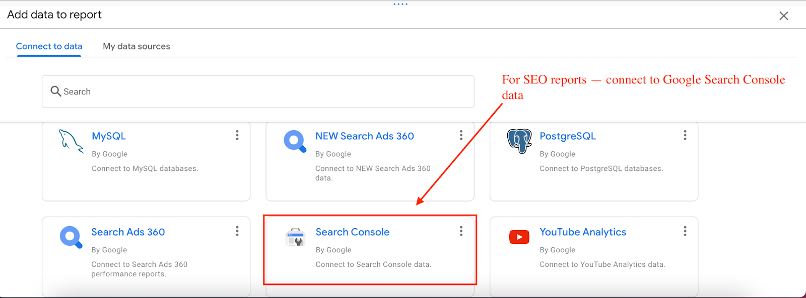 Then, you will need to select your preferred connector. For the purpose of this article, I will simply connect data from Google Search Console. Because Google has the most complete and comprehensive SEO dataset for websites, this is one of the most reliable and up-to-date data sources to build SEO dashboards.
