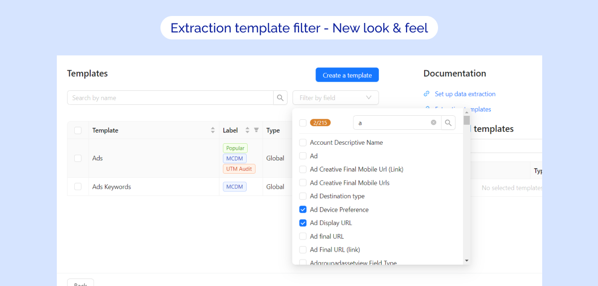 We're given a refreshed makeover to the Extraction template filter! Now, searching and filtering metrics and dimensions have become even easier and more intuitive than before.