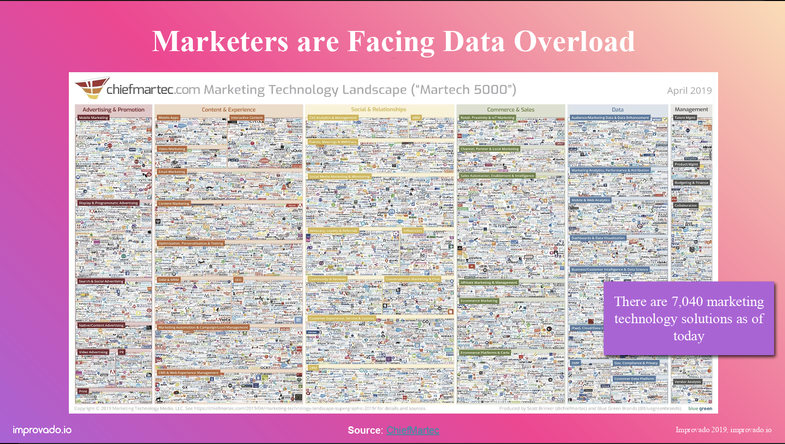 The number of applications dedicated to marketing has exploded, up 20X over the last 10 years to over 7,000 platforms. The average marketer uses at least 12 different platforms (this includes platforms used to run ads, email automation, web analytics, social, search, SEO, CRM, CDPs and more) and this is likely an understatement.